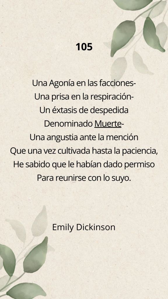 Cuando llega la frase “Éxtasis de despedida”, todo cambia. Ya no es solo una escena, se vuelve rito. Lo físico y lo espiritual se entrelazan y reciben un nombre rotundo: Muerte. Ahí entendí que Dickinson no describe para consolar, describe para mostrar lo que ocurre, aunque incomode.